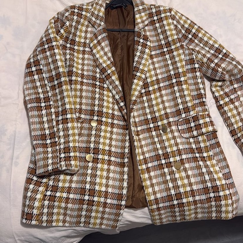 Düğmeli kahverengi midi blazer, keskin yaka ve uzun kollu. Parlak sentetik kumaştan, günlük sokak stili için uygun.