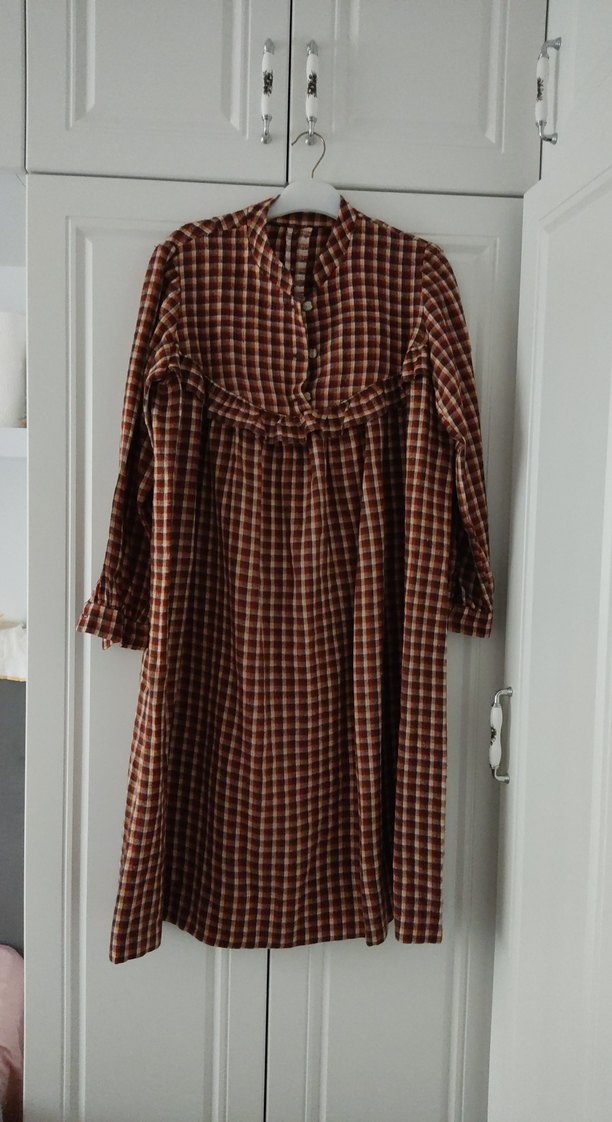 Yumuşak keten kumaştan, uzun kollu ve düğmeli kahverengi hamile tuniği. Salaş kesim ve yuvarlak yakalı, vintage bohem tarzda, günlük kullanıma uygun. 42-44 bedene uyumlu