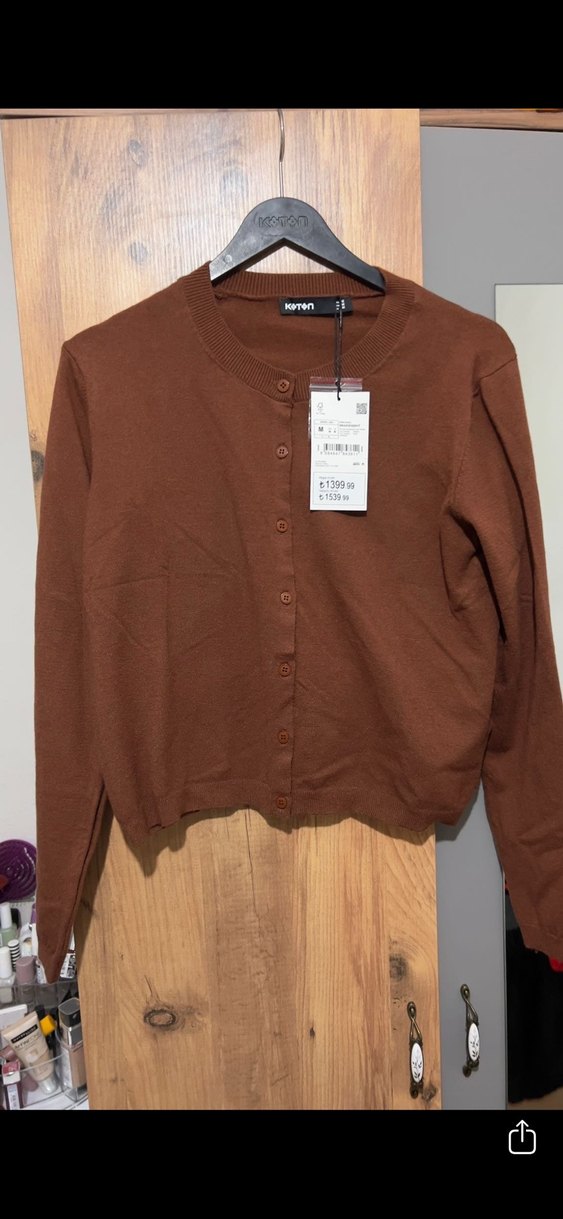 Kahverengi, uzun kollu, düğmeli ve yuvarlak yakalı midi uzunlukta pamuk hırka. Rahat kesimiyle günlük sokak stiline uygundur.