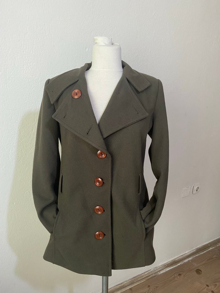 Kahverengi kaban, düğmeli ve kesik yaka detaylıdır. Normal kesim, uzun kollu ve midi boydadır. Ofis ve sokak stiline uygundur.
