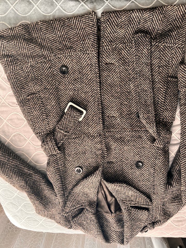 Düğmeli önü ve keskin yaka detayı olan, yumuşak sentetik kumaştan yapılmış, uzun kollu, kahverengi tonlarında midi uzunlukta, günlük sokak stili için uygun, vücuda oturan kaban.kemerindeki deformeyi ekledim teklif verebilirsiniz