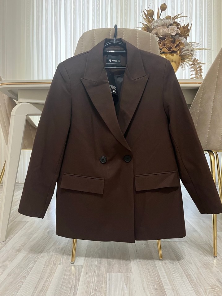 Kahverengi, düğmeli kadın blazer, normal midi boyda ve uzun kollu. Sentetik kumaştan, regular fit ve damaksız yakalı. Ofis ve günlük kullanıma uygun, sade ve şık bir tasarım.