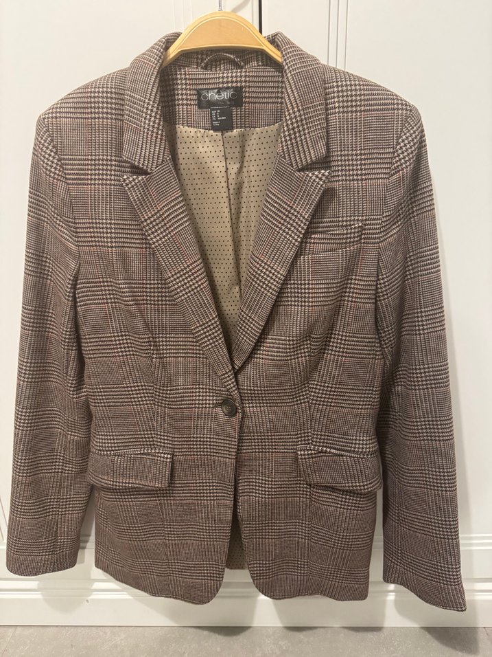 Düğmeli ve uzun kollu kahverengi kadın blazer ceket, normal uzunlukta ve regular fit. Ofis ve günlük rahat stil için uygundur.