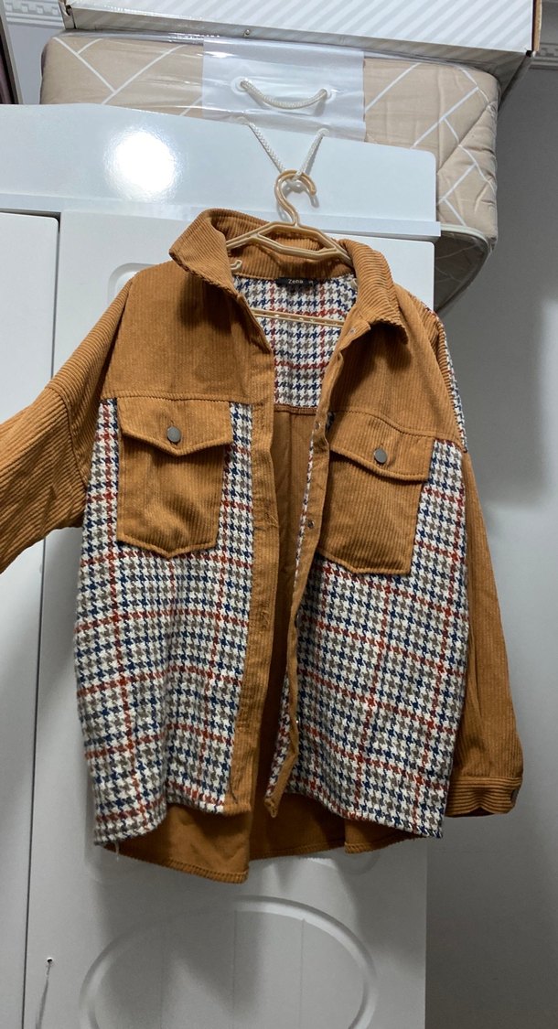 Düğmeli, uzun kollu, kahverengi midi gömlek. Cep detaylı, desenli panelli ve bol kesim. Günlük rahat sokak stili için uygundur.
