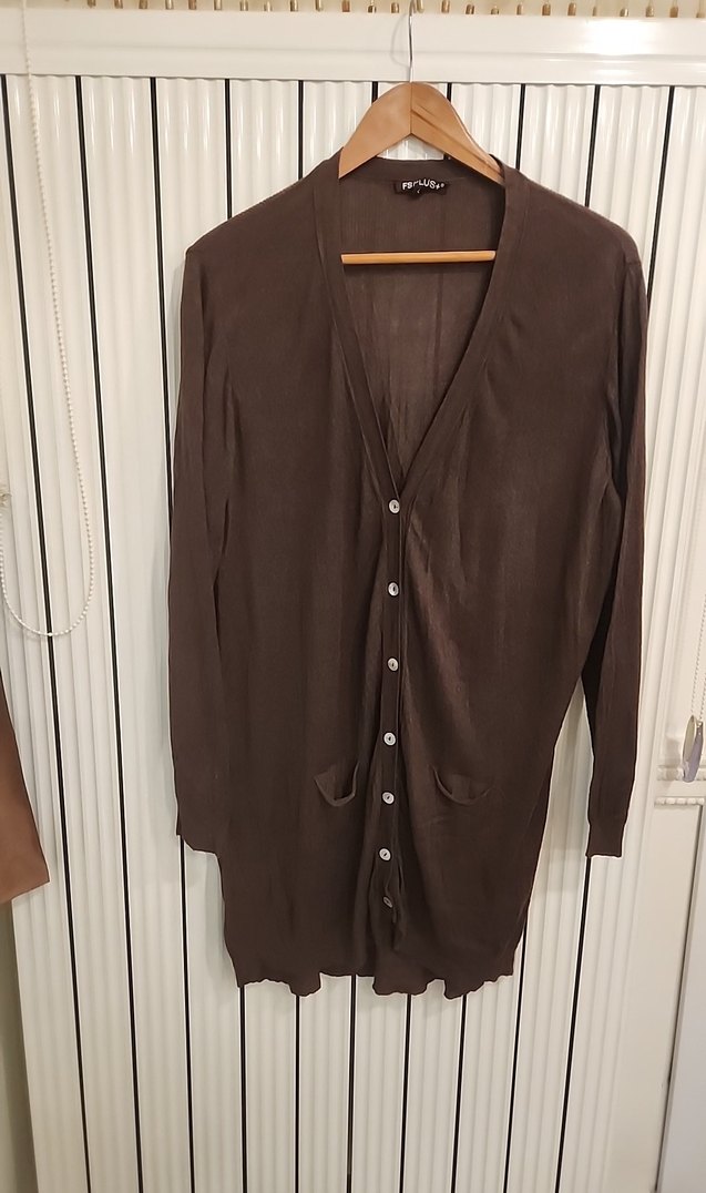Kahverengi midi uzunlukta, düğmeli ve V yakalı kadın hırka. Rahat kesimli, uzun kollu ve yumuşak viskon kumaştan üretilmiştir. Hafif tüylenmeler var.