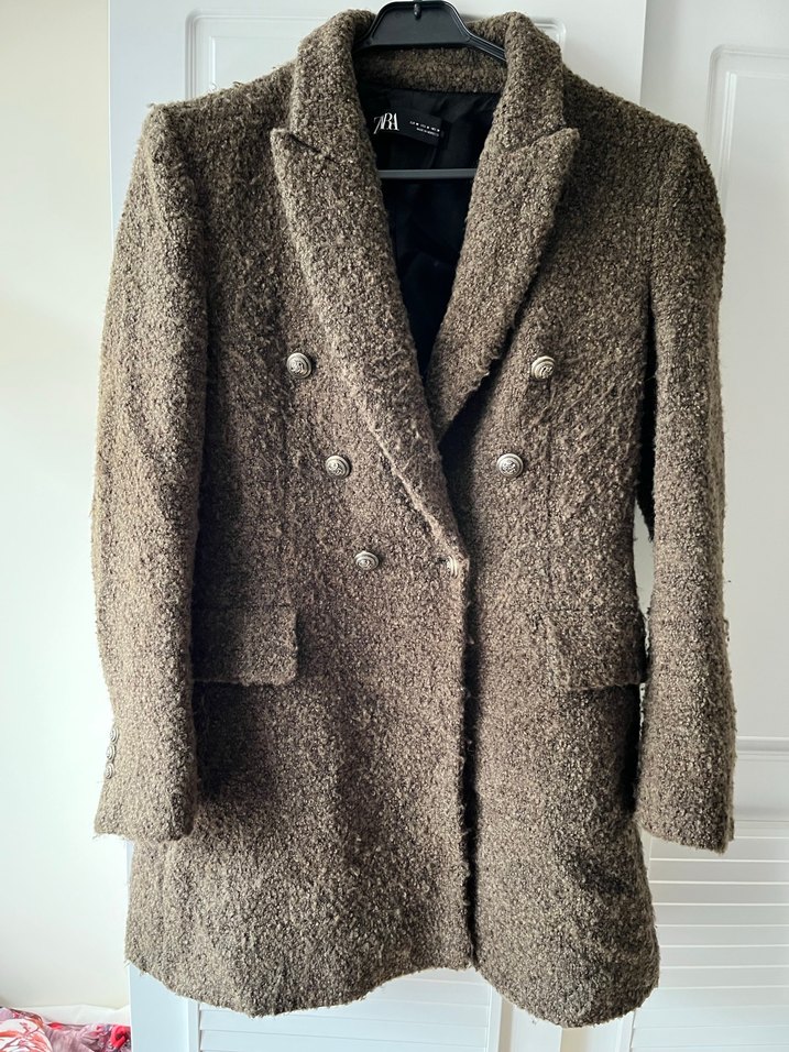 Bu kahverengi yün kaban, düğmeli ön ve kesik yakaya sahiptir. Normal kesim, uzun kollu ve midi boydadır, günlük kullanım için uygundur.