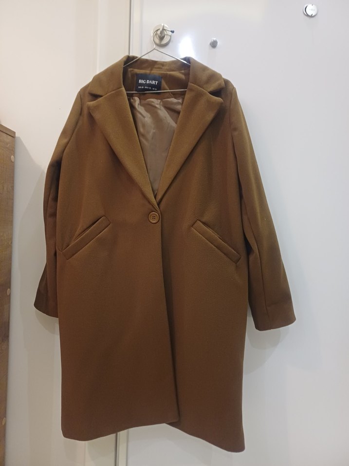 Kahverengi midi kaban, düğmeli ve kesik yaka detayına sahiptir. Uzun kollu, parlak dokulu ve sade tasarımlıdır. Günlük kullanıma uygundur.