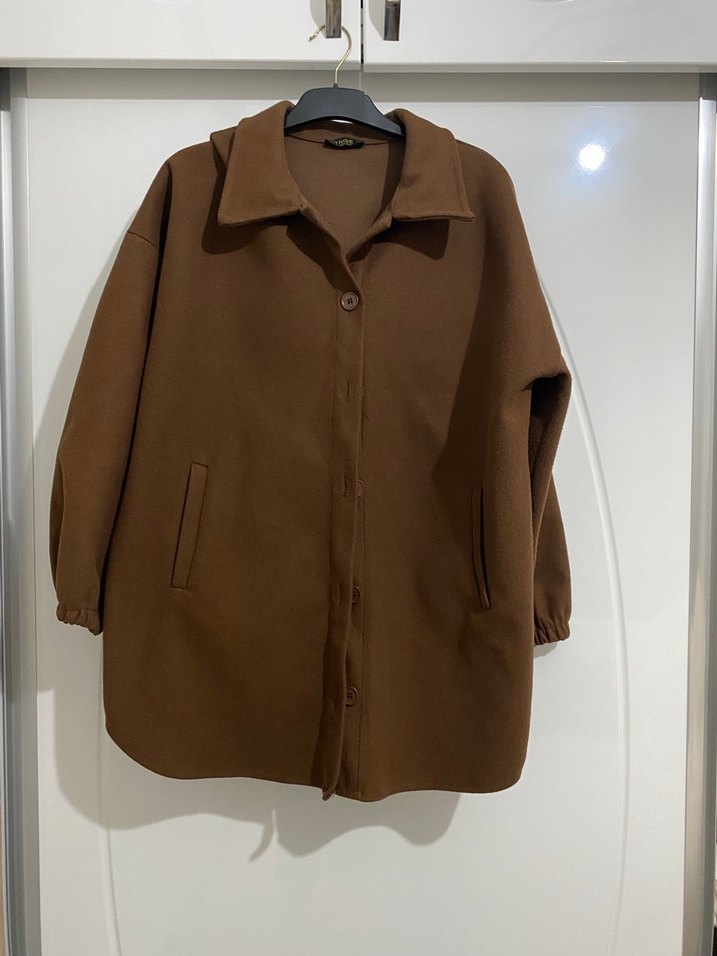 Düğmeli, uzun kollu, kahverengi midi kadın kaban. Geniş kesim, yumuşak ve sıcak dokulu kumaştan, günlük kullanım için uygundur. Minik bir defosu vardır ama çok dikkat çekmiyor