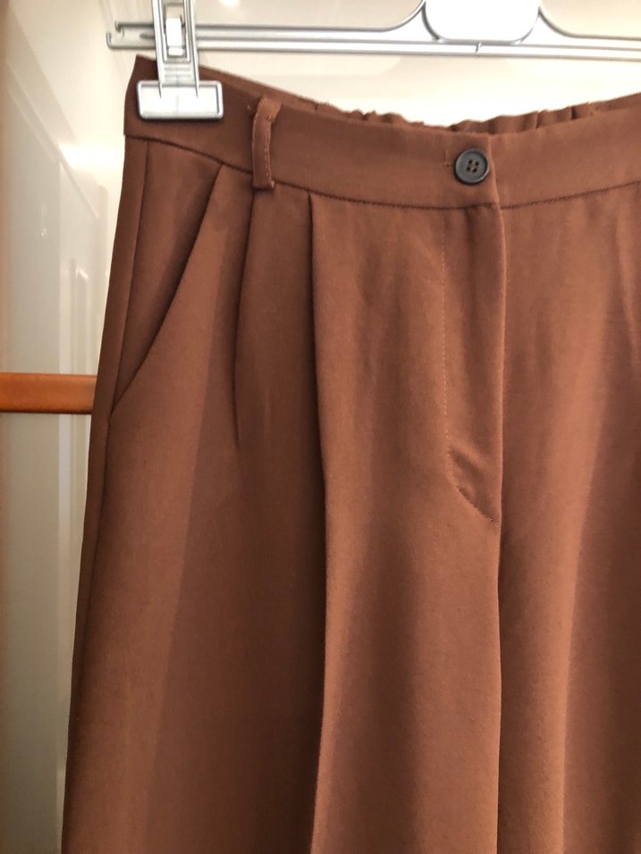 Düğmeli, kahverengi midi uzunlukta, bol kesim pantolon. İpek gibi kumaştan, minimalist ve normcore tarzda, ofis için uygun koyu renkte, desensiz model.