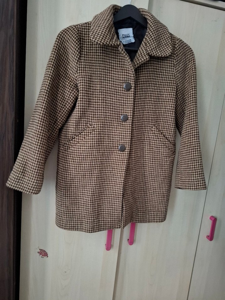 Düğmeli, yaka detaylı kadın palto. Yün kumaştan, normal kesim ve uzun kollu. Kahverengi ve gri kareli desende, günlük kullanım için uygun. 13/14 yaş ama 7/10 arası giyebilir