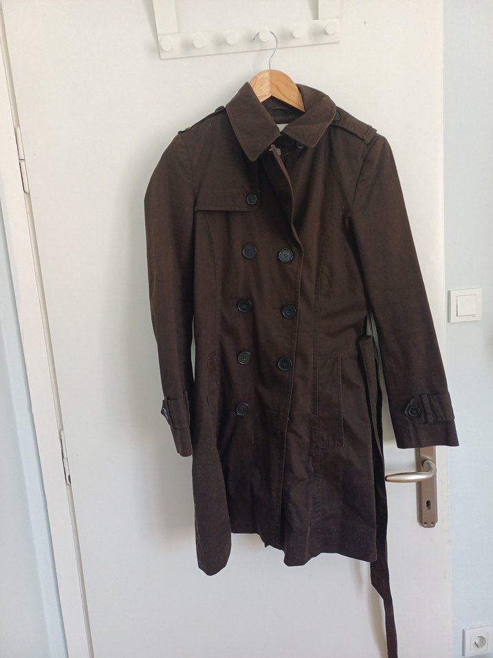 Kahverengi kadın trençkot, düğmeli, çıt çıtlı, normal boyda midi uzunlukta ve uzun kolludur. Paris tarzı, günlük sokak modasına uygun rahat kesimdir. azı yerlerinde solma var, onun dışında hicbir kusuru yok. boy 89 cm en koltuk altından 50 cm kol boyu 62 cm #zara #zaratrençkot #trençkot #rüzgarlık