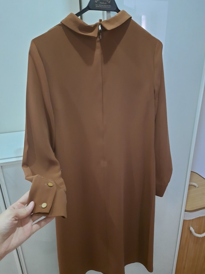 Düğmeli manşetli uzun kollu, yüksek yakalı kahverengi tunik. Tuğba markası ,38 bedene uygun,hiç bir problemi yok