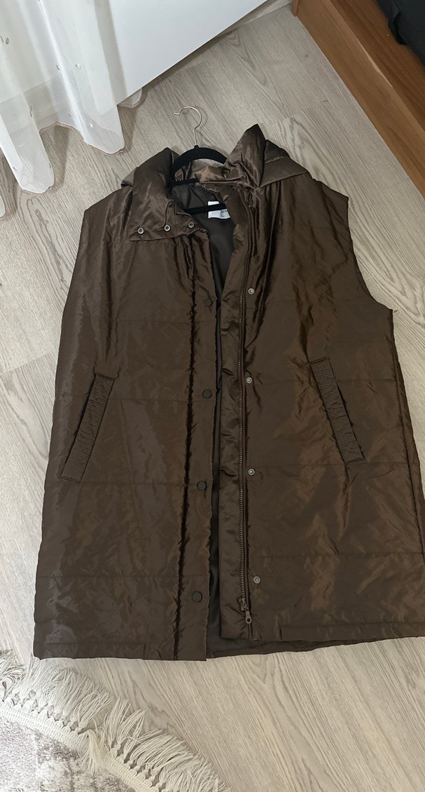 Düğmeli, kahverengi midi uzunluğunda, yakalı ve kolsuz kadın yeleği. Rahat kesimli ve sentetik kumaştan, günlük sokak stili için uygun.