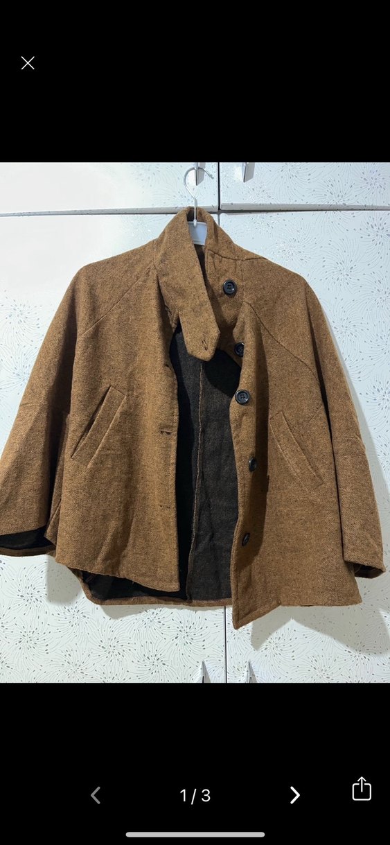 Kahverengi yün kaban, düğmeli ön, uzun kollu ve salaş kesimdir. Notlu yakası ve midi boyuyla günlük kullanıma uygundur.