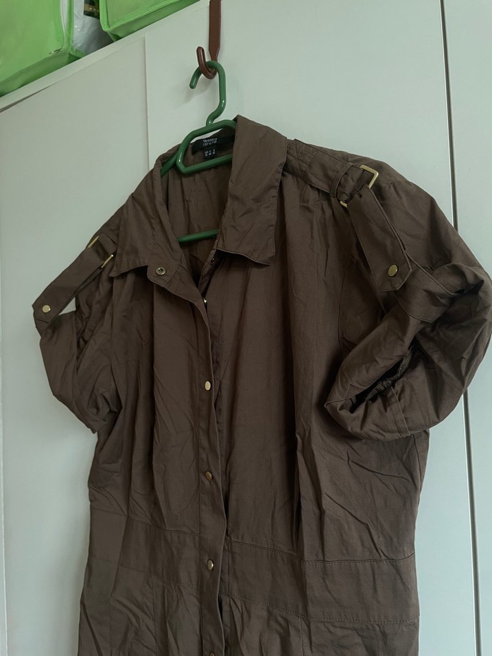 Kahverengi keten ceket elbise,düğmeli ön ve yakalı tasarıma sahip. Bol kesim ve uzun kollu, günlük rahat kullanım için idealdir. Minimalist ve desensiz stilde, sokak modasına uygun.