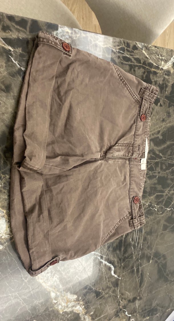 Düğmeli detaylara sahip, kahverengi keten kumaştan, midi boyda, rahat kesim pantolon. Desensiz ve günlük dış mekan kullanımı için uygun.