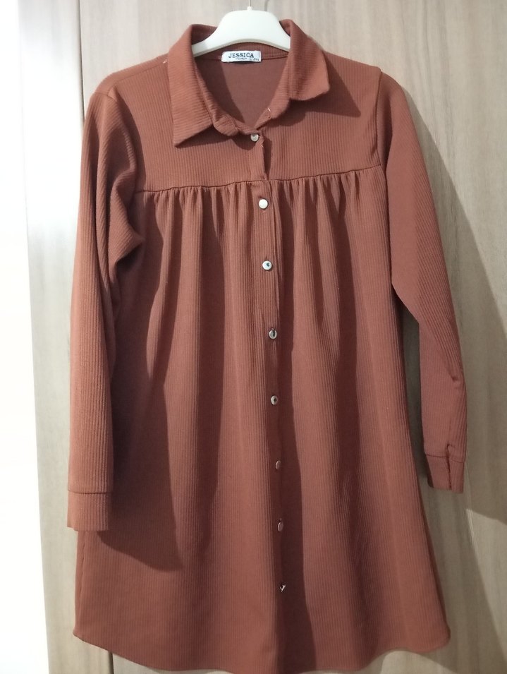 Kahverengi midi boy, keten kumaştan, düğmeli, yakalı ve uzun kollu bol kesim tunik. Günlük kullanıma uygun sade tasarım. 38.40 bedene olur