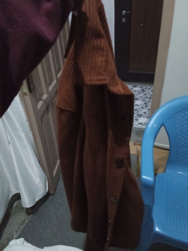 Düğmeli, kahverengi süet hamile kabanı, notalı yaka ve uzun kollu. Günlük kullanıma uygun, rahat sokak stiliyle uyumlu.