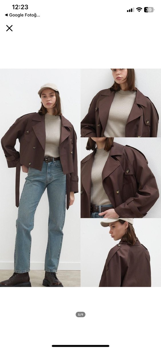 Kahverengi midi trençkot, kesik yaka ve düğmeli ön kısmıyla dikkat çeker. Sentetik kumaştan üretilmiş, askılı kollu ve desen içermeyen günlük kullanıma uygun bir üründür.