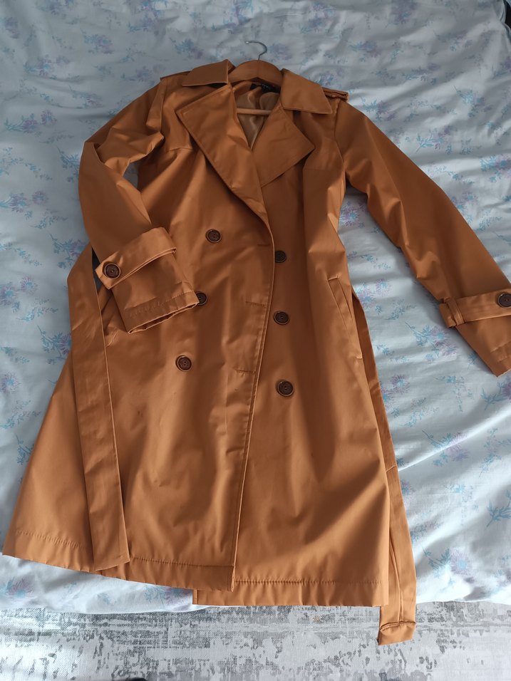 Parlak görünümlü, düğmeli kahverengi midi trençkot. Uzun kollu, kesik yaka ve rahat kalıplı, sentetik kumaştan üretilmiştir.