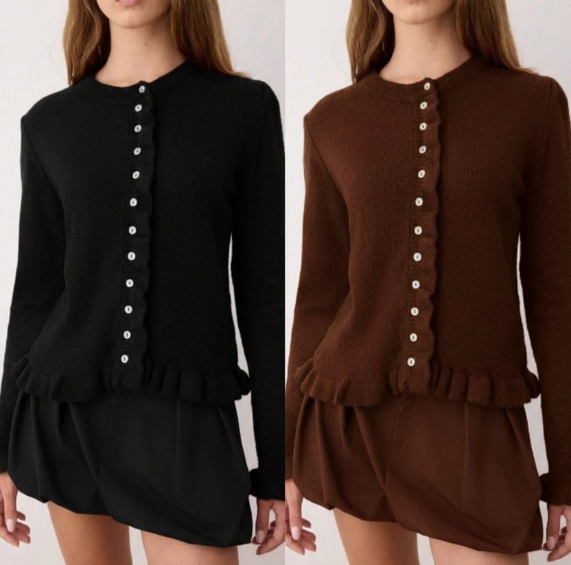 Standart beden Fitted kesim, düğmeli ön ve yuvarlak yakalı midi hırka. Yumuşak kahverengi triko kumaştan, uzun kollu ve hafif fırfırlı etek ucu detaylı. Günlük kullanıma uygun, Paris esintili.