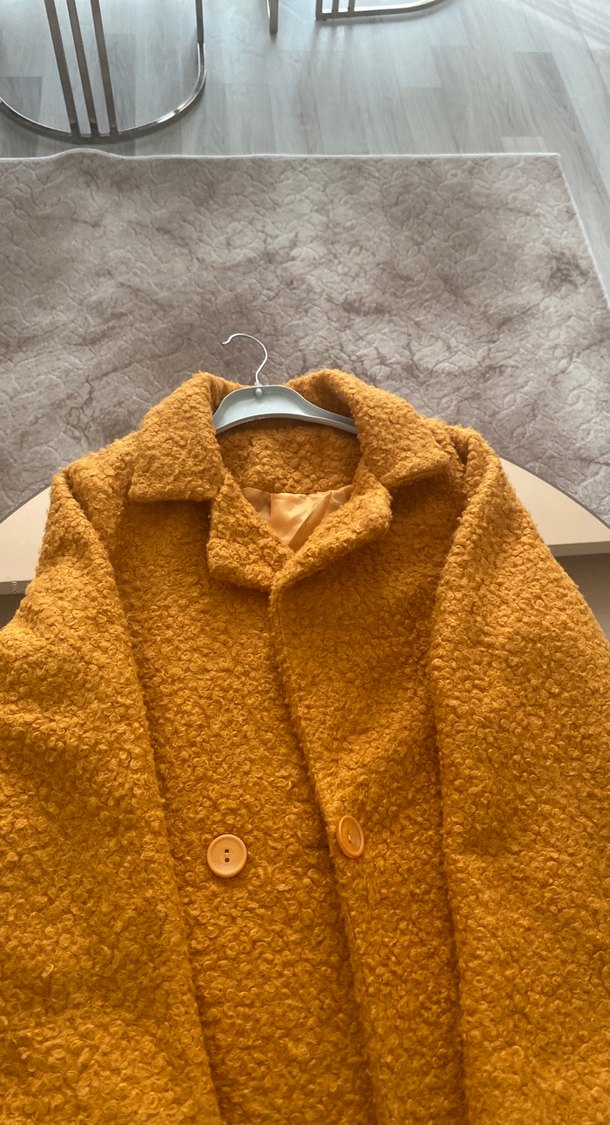 Bu kahverengi yün kaban, düğmeli ön kısmı, notched lapel yakası ve uzun kollara sahiptir. Gevşek kesim ve midi boyuyla gündelik kullanıma uygundur. İç kısmında astarında ufak bir yırtık var kolayla hal olur başka bir hasarı yoktur