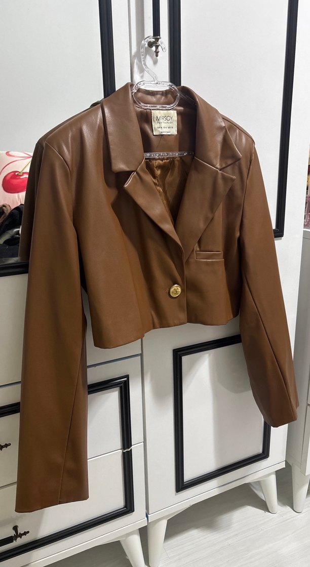 Kahverengi deri ceket, düğmeli ve kesimli yakaya sahiptir. Kısa boylu ve uzun kolludur, rahat kesimiyle günlük ve ofis kullanımı için uygundur. Desensiz ve şık görünümlüdür.