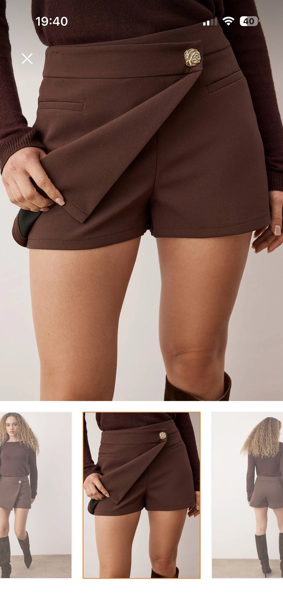 Düğmeli, kahverengi mini etek, sentetik kumaştan, minimalist ve çağdaş tarzda, günlük kullanıma uygun.
