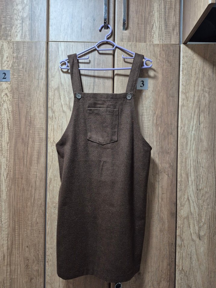 Düğmeli askılı ve ön cepli kahverengi elbise. Desensiz ve sade tasarıma sahiptir.