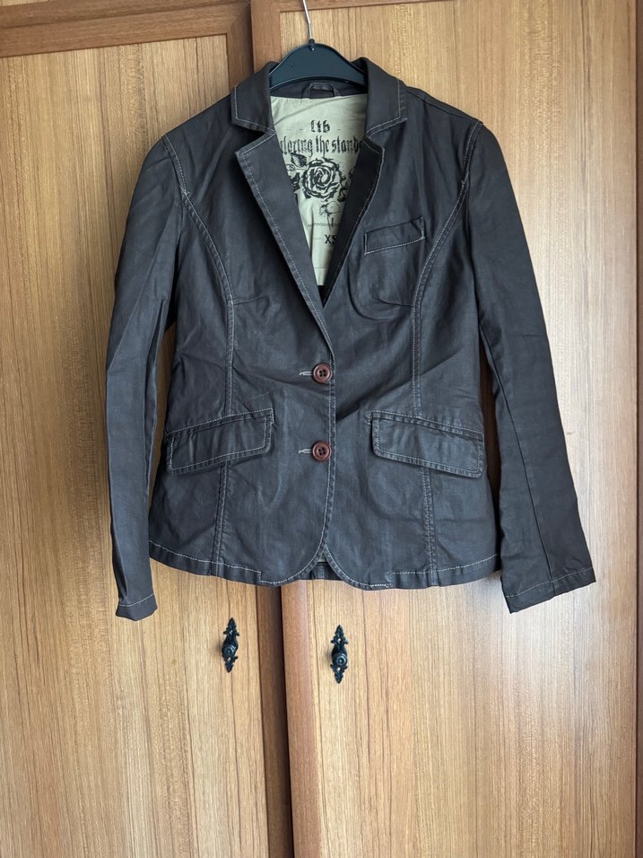 Düğmeli, kahverengi deri kadın ceket. Normal uzunlukta, uzun kollu ve regular fit kesimiyle ofis için uygundur. Notch yakalı ve desensizdir.
