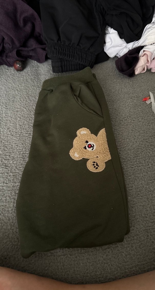 Düğmeli, nakışlı ayıcık detaylı, koyu kahverengi bol kesim erkek eşofman altı. Yumuşak ve sıcak kumaştan üretilmiştir.