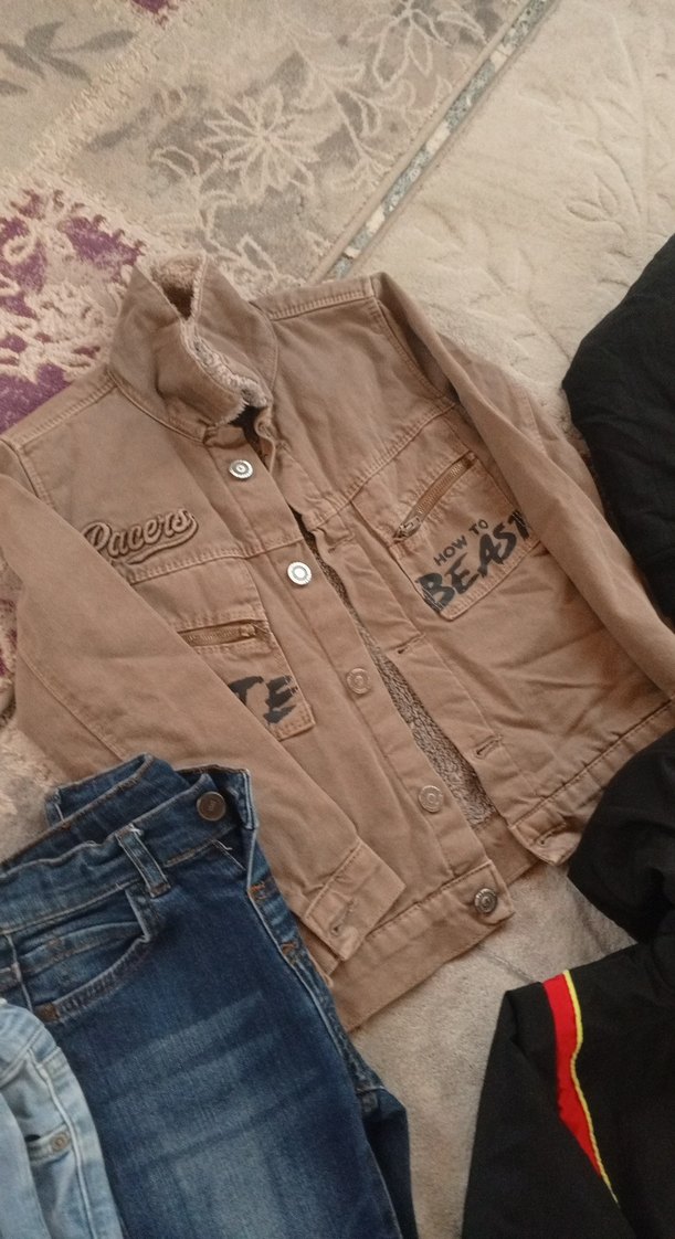 Düğmeli, kahverengi kot ceket, nakışlı detaylı ve notched lapel yakalı, rahat kesim ve streetwear tarzında. üç adet mont 6 yaşa kadar kullanım olur fazlasıyla 4 adet sıfır ayarında kot pantolon sweatshirt eşofman alt hepsi marka hepsi kusursuz