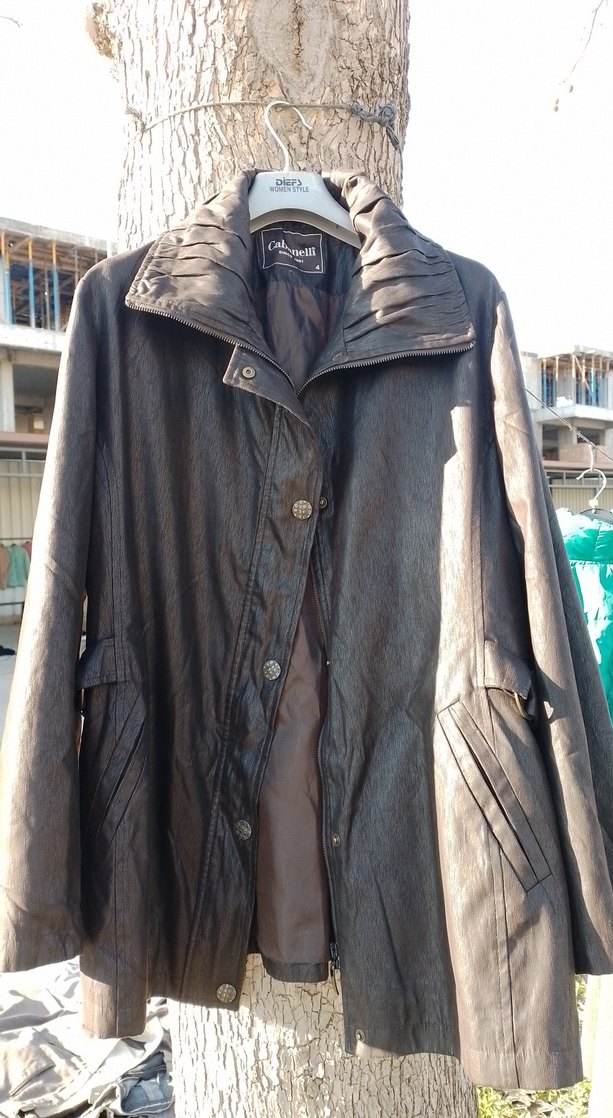 Kahverengi paraşüt kumaştan kadın ceket, düğmeli ve kesimli yakaya sahiptir. Uzun kollu, normal kesim ve parlak dokuludur, günlük sokak stiline uygundur.