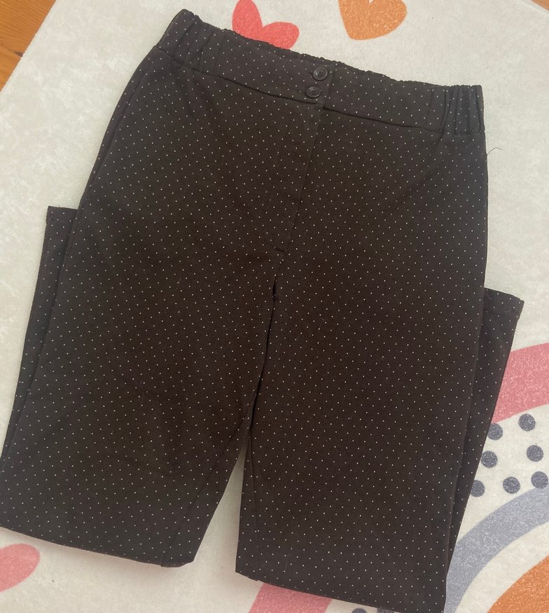 Düğmeli detaylı, koyu kahverengi puantiyeli,, ofis için uygun, dar kesim bilek boy pantolon.27 bedendir ufak bır yırtık var gosterdıgım yerde aöa dıkılebılır onun dısında yenıden farksız bır urun