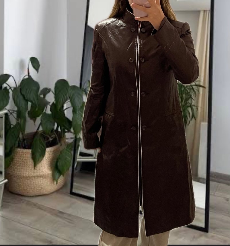 Düğmeli, kahverengi saten kaban kesimli yaka ve uzun kolludur. Ofis veya günlük kullanıma uygundur. 38/40 beden