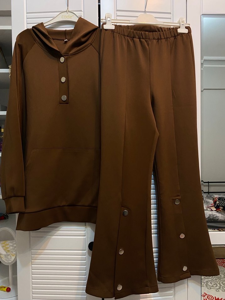 Düğmeli ön kısmı, uzun kollu ve yakası kesimli kahverengi kadın eşofman takımı. Rahat kesim ve uzun boy, yumuşak ve scuba kumaştan, günlük sokak giyimine uygun. Alt pantolon düğme detaylı. Temiz kullanılmıştır herhangi bir kusuru yoktur. Sweat boyu 75 cm’dir. Pantolon ispanyol paçalıdır.