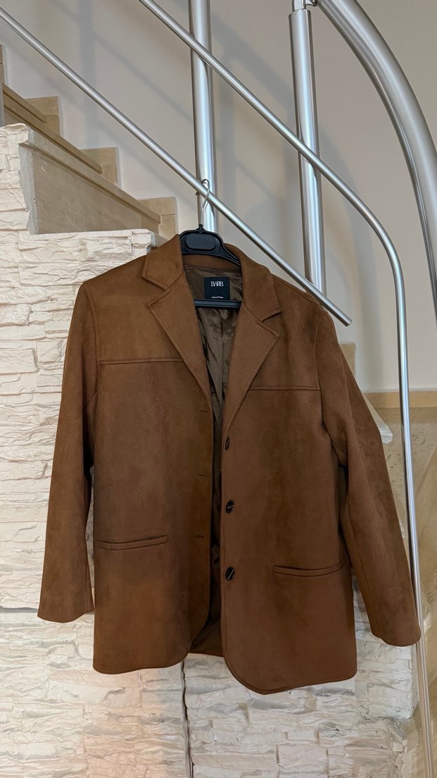 Kahverengi süet erkek ceket, düğmeli ve kesik yakalıdır. Normal kesim, uzun kollu ve parlak görünümlüdür. Ofis kullanımı için uygundur.