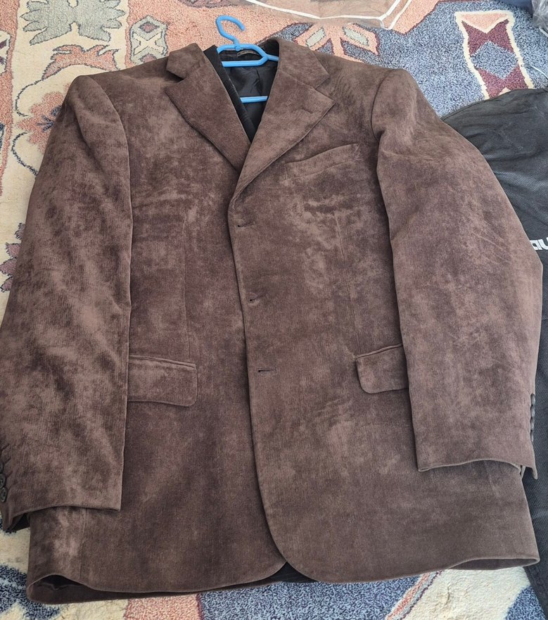 Kahverengi süet erkek ceket, düğmeli, uzun kollu ve normal kesimdir. Midi boyda olup ofis için uygun, trend sokak tarzında bir parçadır.
