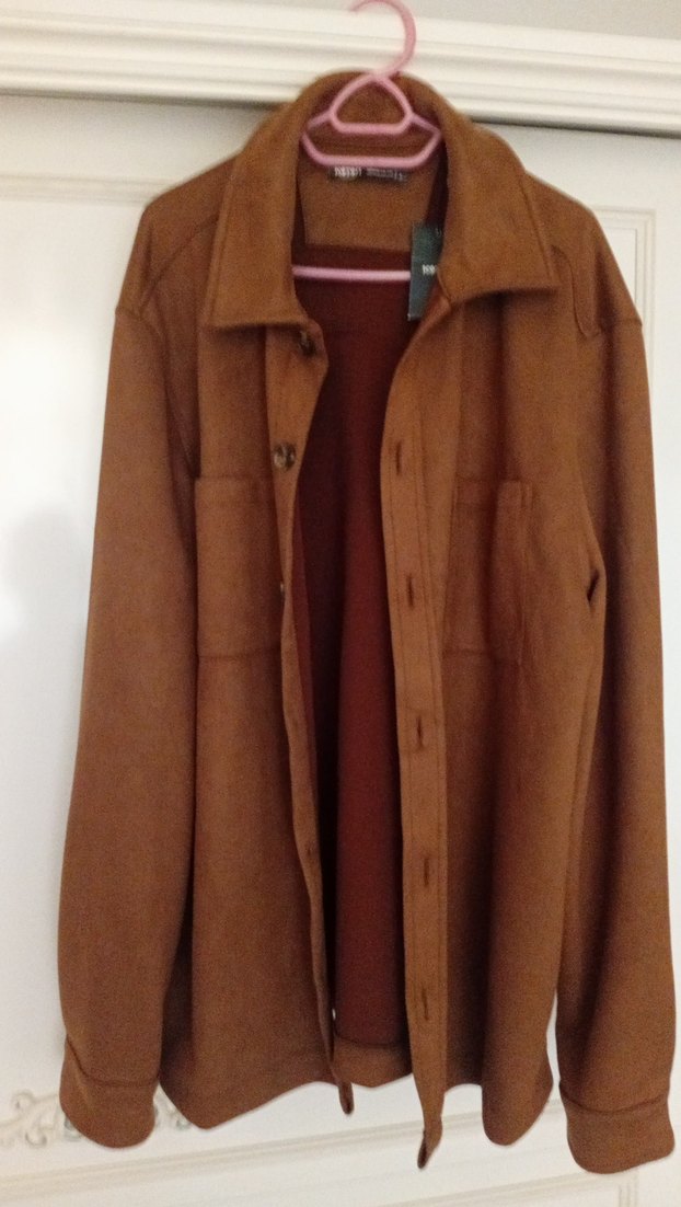 Düğmeli, kahverengi süet kumaştan, normal boyda, bol kesim erkek ceket. Notch yaka ve uzun kolludur. Günlük sokak stili için uygundur.