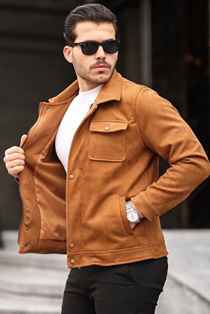 Kahverengi süet erkek ceket, düğmeli, notalı yaka ve uzun kolludur. Rahat kesim ve midi boy tasarımıyla günlük sokak stili için uygundur. Göğüs cepli ve parlak yüzeylidir.