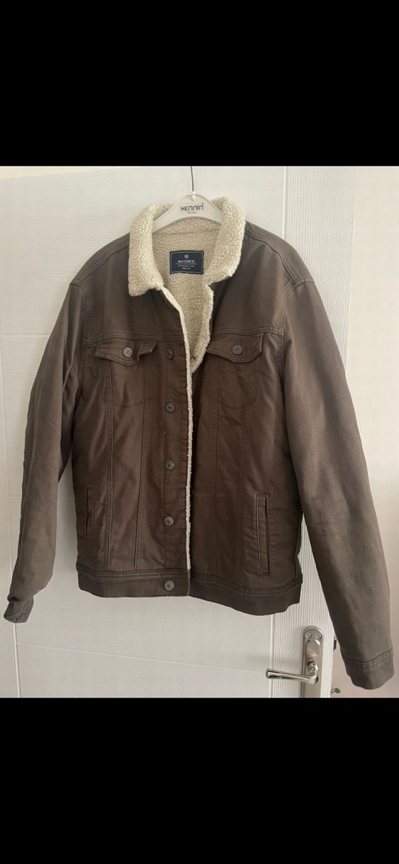 Düğmeli, notched lapel yakalı kahverengi süet erkek ceket. Uzun kollu, regular fit ve sıcak tutan astarlı, günlük sokak tarzına uygun bir parça.