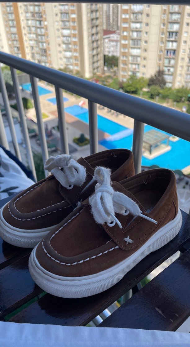 Düğmeli tasarıma sahip koyu kahverengi süet erkek çocuk ayakkabısı, beyaz bağcık ve dayanıklı beyaz taban içerir.