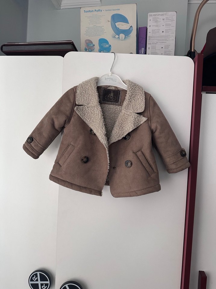 Düğmeli ön kısım ve kesik yaka detayına sahip, kahverengi süetten yapılmış erkek çocuk kabanı. Rahat kesimi ve sıcak astarıyla sokak tarzını yansıtır.