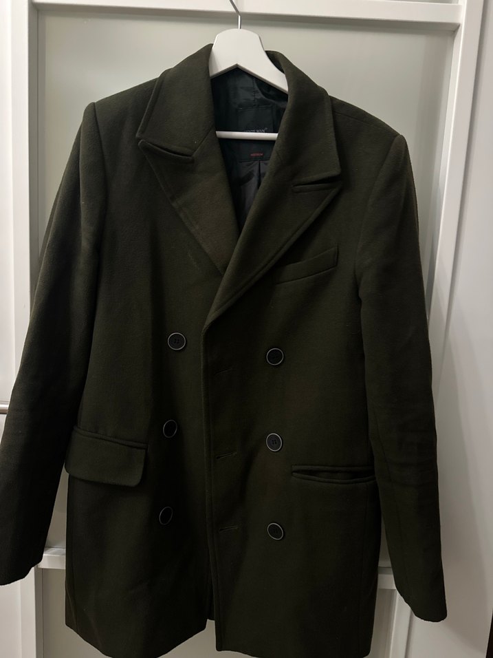 Kahverengi süet kumaştan, düğmeli ve uzun kollu erkek kaban. Normal kesim, midi boy, ofis ve sokak stiline uygun. m beden . Sorunsuz. Marka temsili
