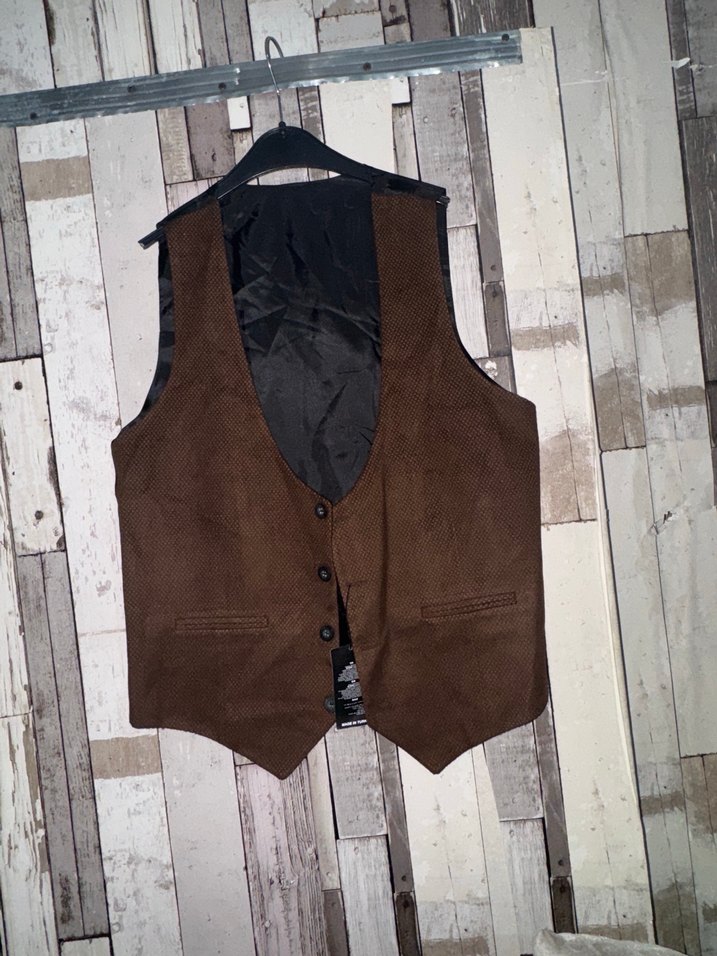 Düğmeli, kahverengi süet kumaştan, kolsuz erkek yeleği. Notlu yaka ve normal kesim, midi boyda, gündelik ,iş,gece stiline uygun.