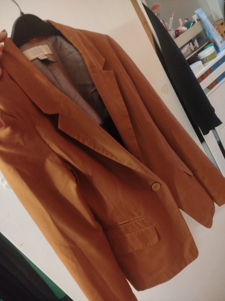 Düğmeli kahverengi süet kadın blazer, kesik yaka ve uzun kolludur. Normal midi boyda, düzenli kesim ve parlak kumaşa sahiptir. İş veya günlük şıklık için uygundur. ✨
