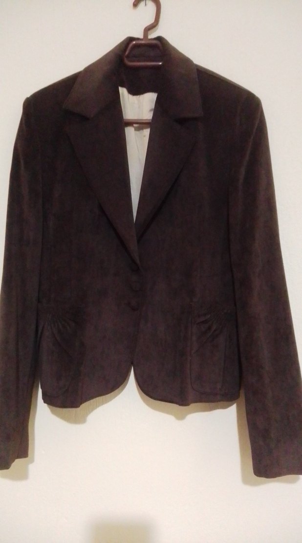 Kahverengi süet kumaştan, düğmeli, klasik ve modern tarzda, ofis kullanımı için uygun, normal uzunlukta ve uzun kollu kadın blazer ceket.