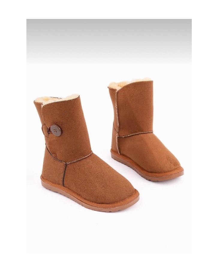 Kahverengi süet malzemeden yapılmış, yan tarafında düğme detayı bulunan kadın botları.