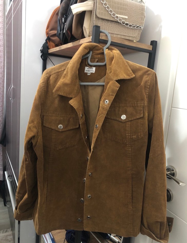 Kahverengi süet kadın vintage havasında ceket, düğmeli ve kesimli yakaya sahiptir. Uzun kollu, normal midi boyda, günlük tarz için uygundur. Desensiz ve rahat kesimlidir.