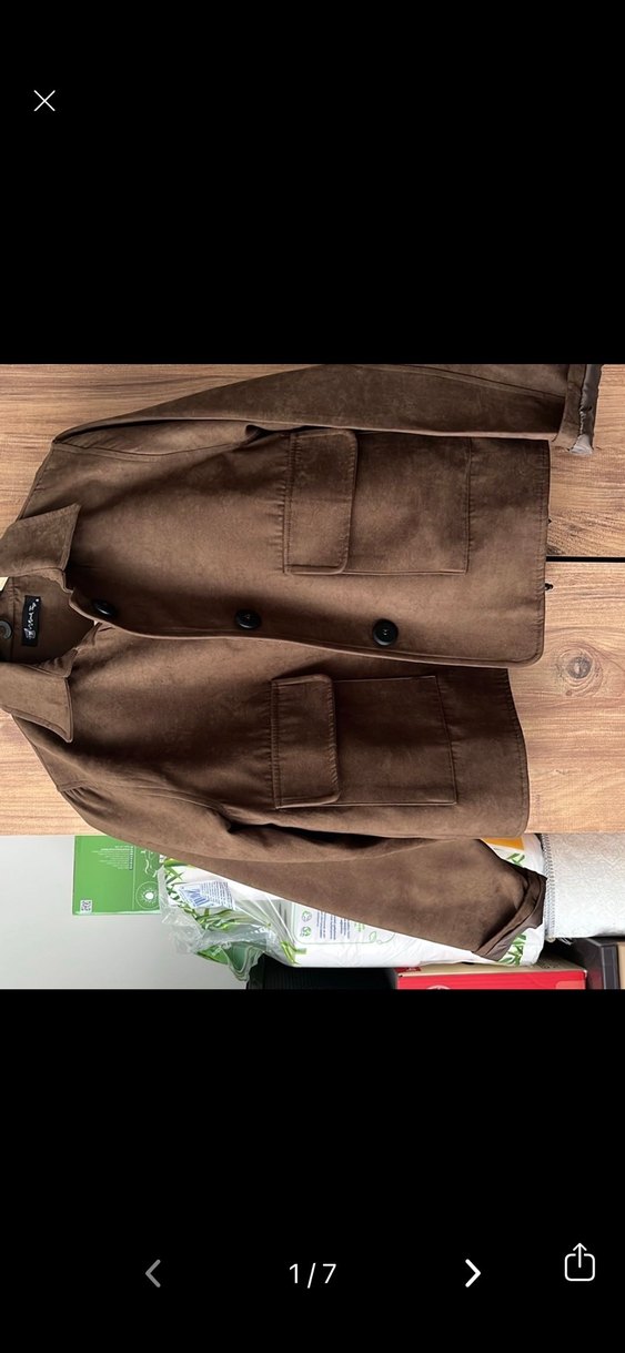 Kahverengi süet kadın ceket, düğmeli ve kesik yaka detayıyla. Uzun kollu, midi boy, günlük sokak stili için uygun. ✨
